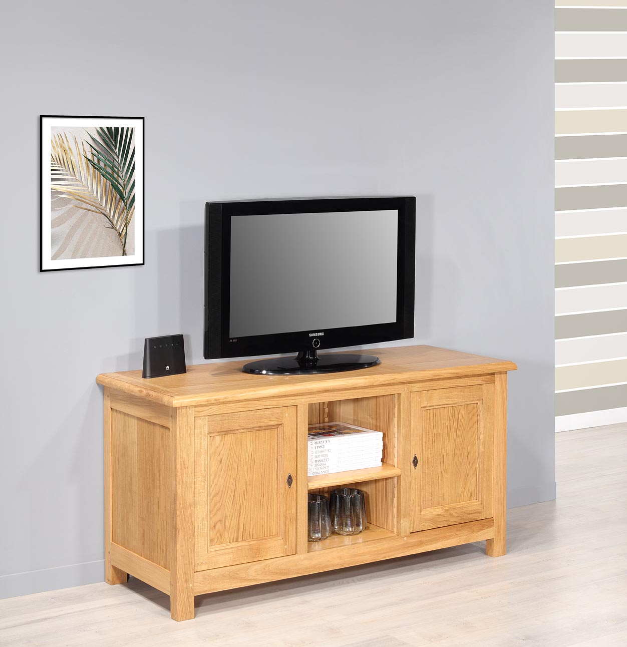 Meuble TV 2 portes en Chêne Massif de style Campagnard, sobre et élégant ce meuble s'intègre dans tous les intérieurs. 1 porte de chaque coté avec à l'intérieur 1 étagère montée sur crémaillères en bois + 1 niche au milieu avec à l'intérieur 1 étagère réglable. Fabrication traditionnelle, Les fonds et les étagères sont en frêne massif, Sa finition est un Chêne Naturel ciré et lustré ou selon votre convenance, N'hésitez pas à demander nos échantillons de bois