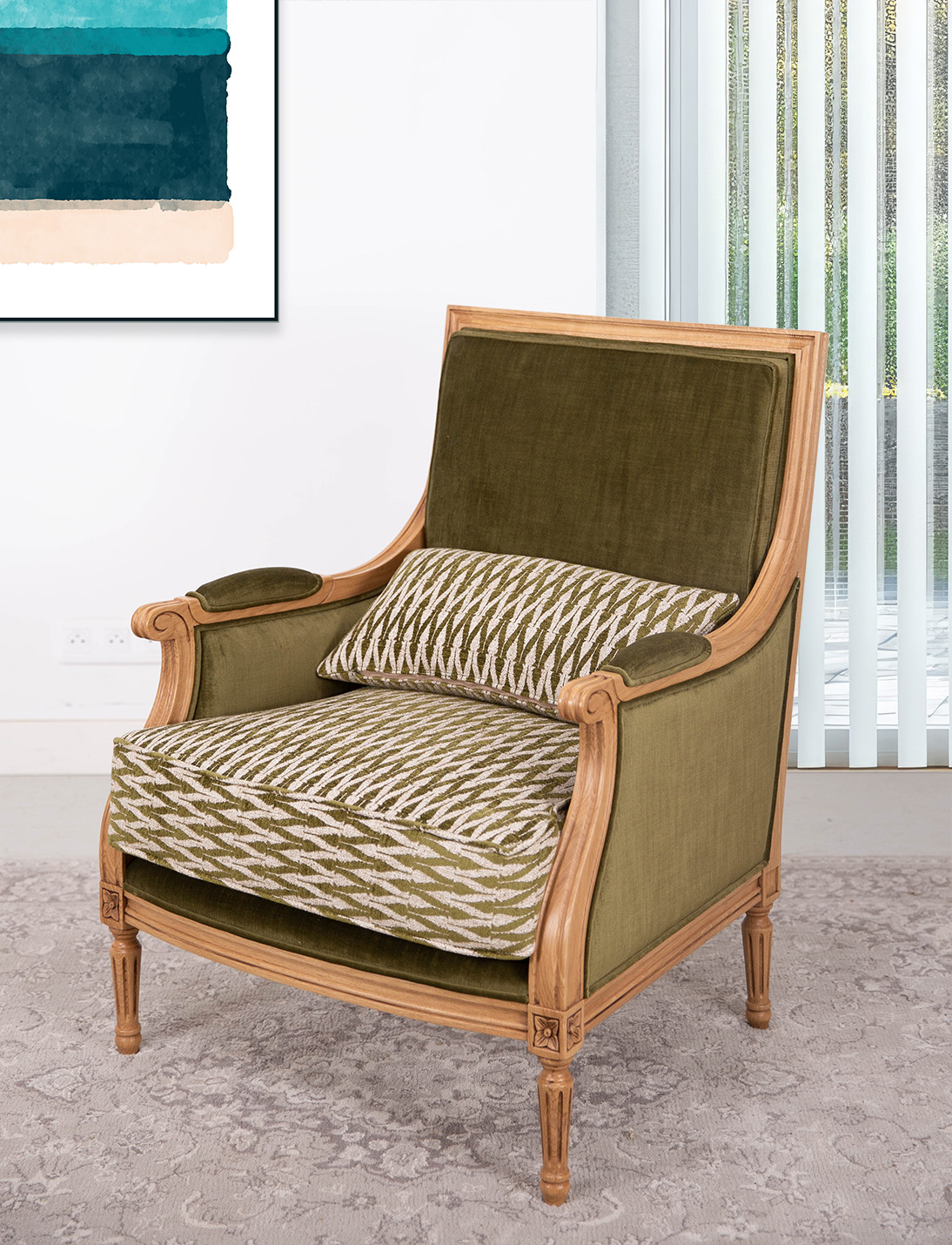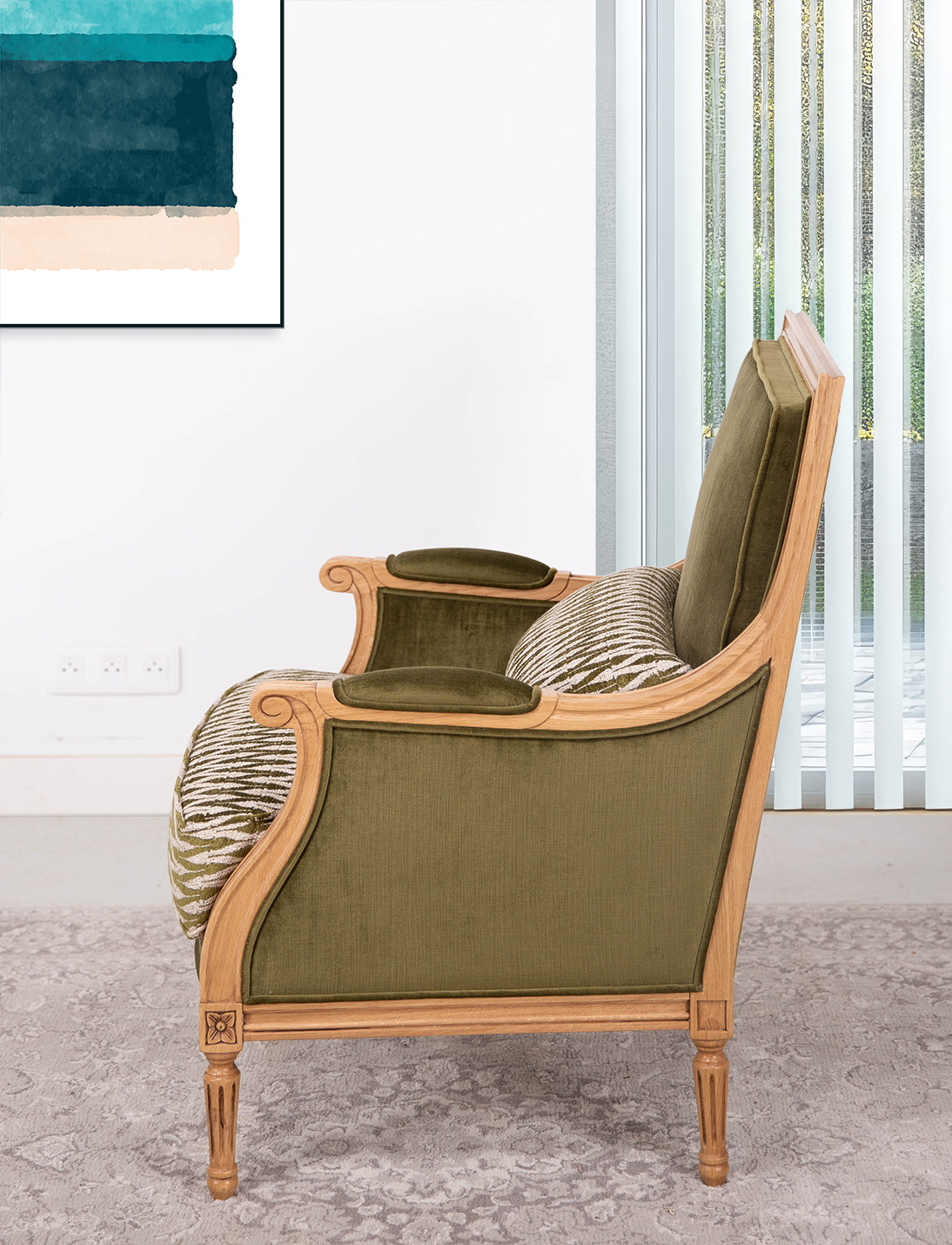 🎀 Élégance intemporelle – Fauteuil Louis XVI 🎀 Un fauteuil qui traverse les époques avec grâceÂ… Assemblé par tenons mortaises, par tourillons pour le dossier et Renforcé par 4 équerres collées vissées. Il est entièrement sculptée à la main. Pieds tournés. Garnissage semi-traditionnel sur sangles élastiques et profilés agglomérés. Dossier et assise garnis mousse haute résilience 36kg/m2 Habillé du tissu de la collection VALDOURO. Sa finition est un chêne naturel ciré et lustré ou teinté selon votre convenance. Demandez vos échantillons de chêne ou contactez-nous pour imaginer votre fauteuil idéal.