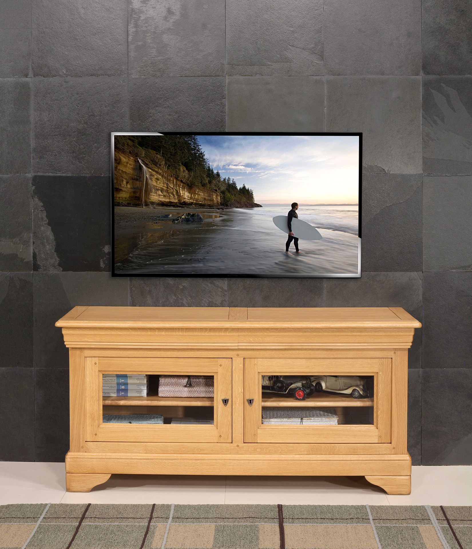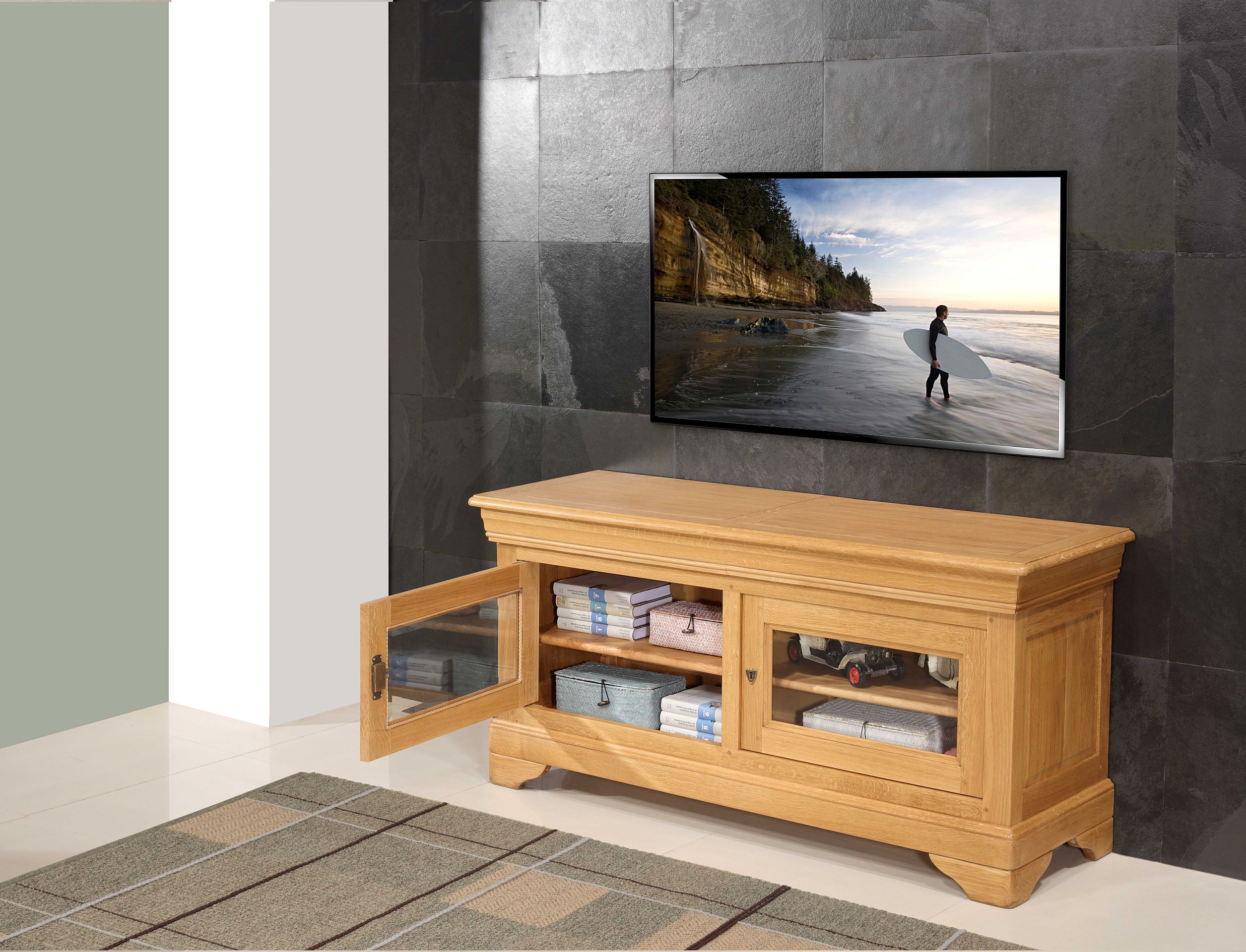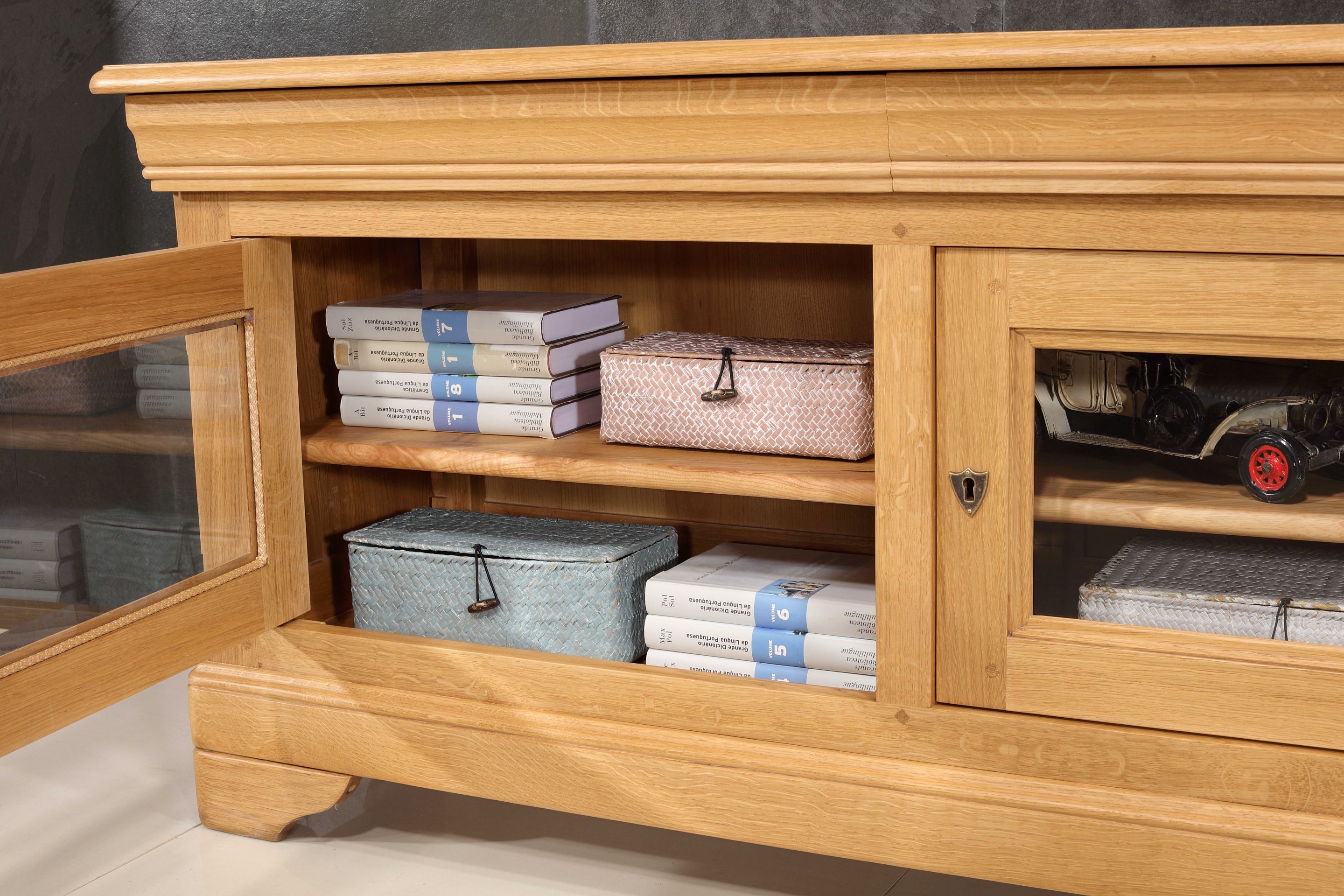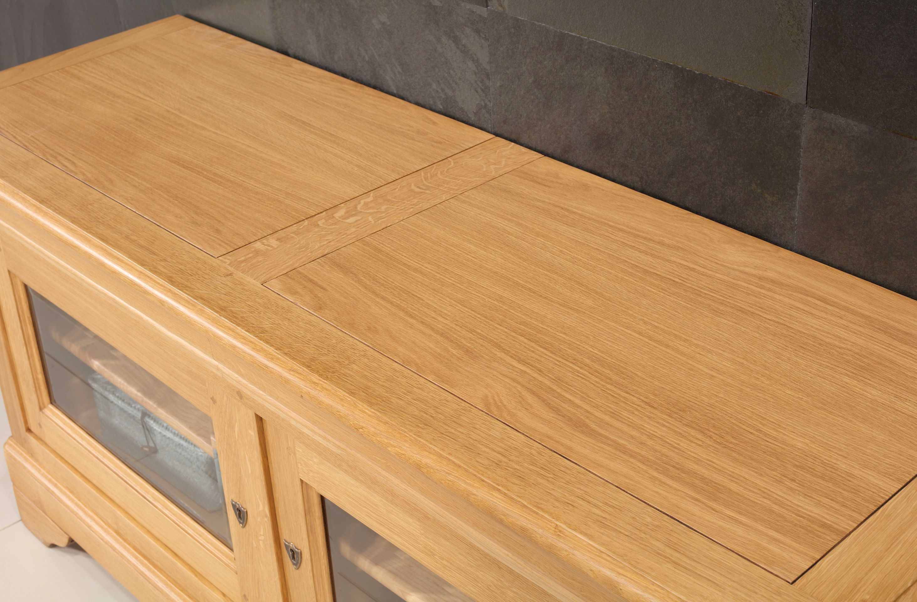 Meuble TV réalisé en Chêne massif de Style Louis Philippe, 2 portes vitrées avec verres biseautés, pour une touche de luminosité et de distinction. 2 tiroirs intégrés dans la moulure, pratiques et discrets. Aménagement intérieur : 1 étagère réglable et amovible de chaque côté, montée sur crémaillères en bois. Fonds et étagères en frêne massif, Sa finition est un Chêne naturel ciré et lustré pour un rendu chaleureux. Possibilité d'un autre finition, avec échantillons disponibles pour choisir la nuance idéale. Les échantillons de chêne sont envoyés gratuitement.
