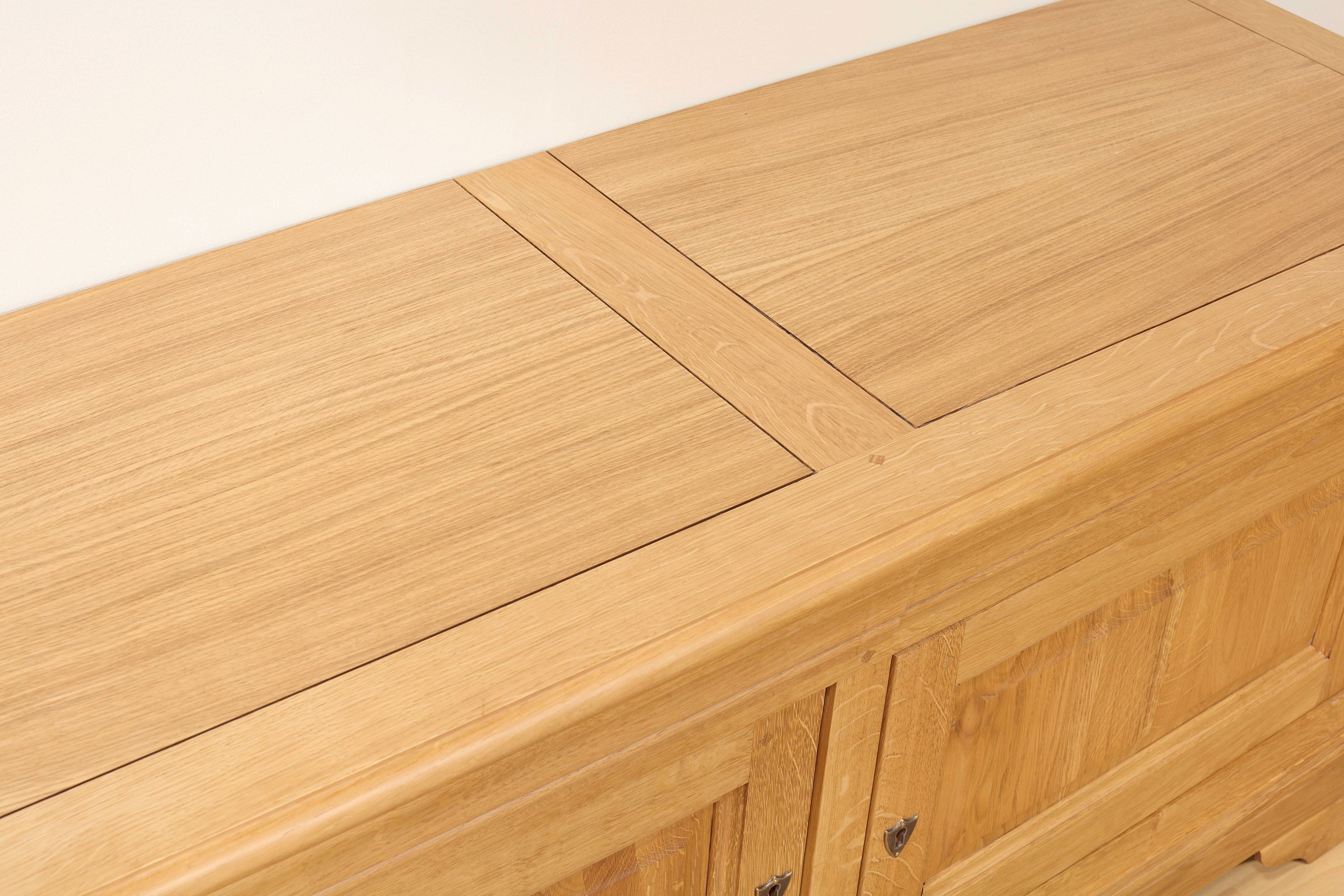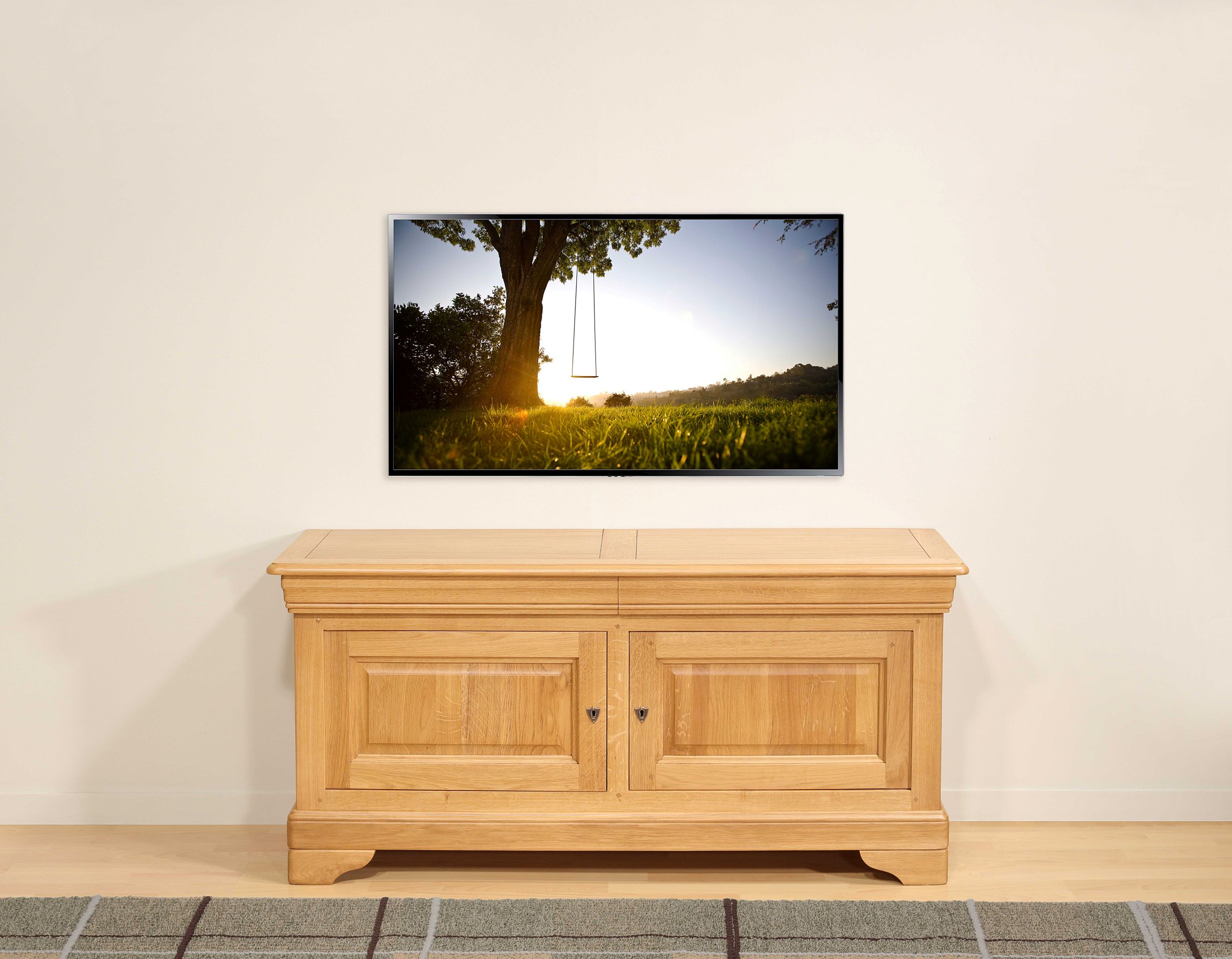 Meuble TV en chêne massif de Style Louis Philippe Fabrication en chêne massif, au charme intemporel du style Louis Philippe Équipé de 2 portes et de 2 tiroirs intégrés dans la moulure, pratiques et discrets À l’intérieur : une étagère réglable sur crémaillères, idéale pour adapter vos rangements (lecteurs, consoles, etc.) Les fonds et l’étagère sont réalisés en bois massif varié (peuplier, frêne,…), garantissant robustesse et authenticité Sa finition est un chêne naturel ciré et lustré, N'hésitez pas à demander nos échantillons de chêne gratuits