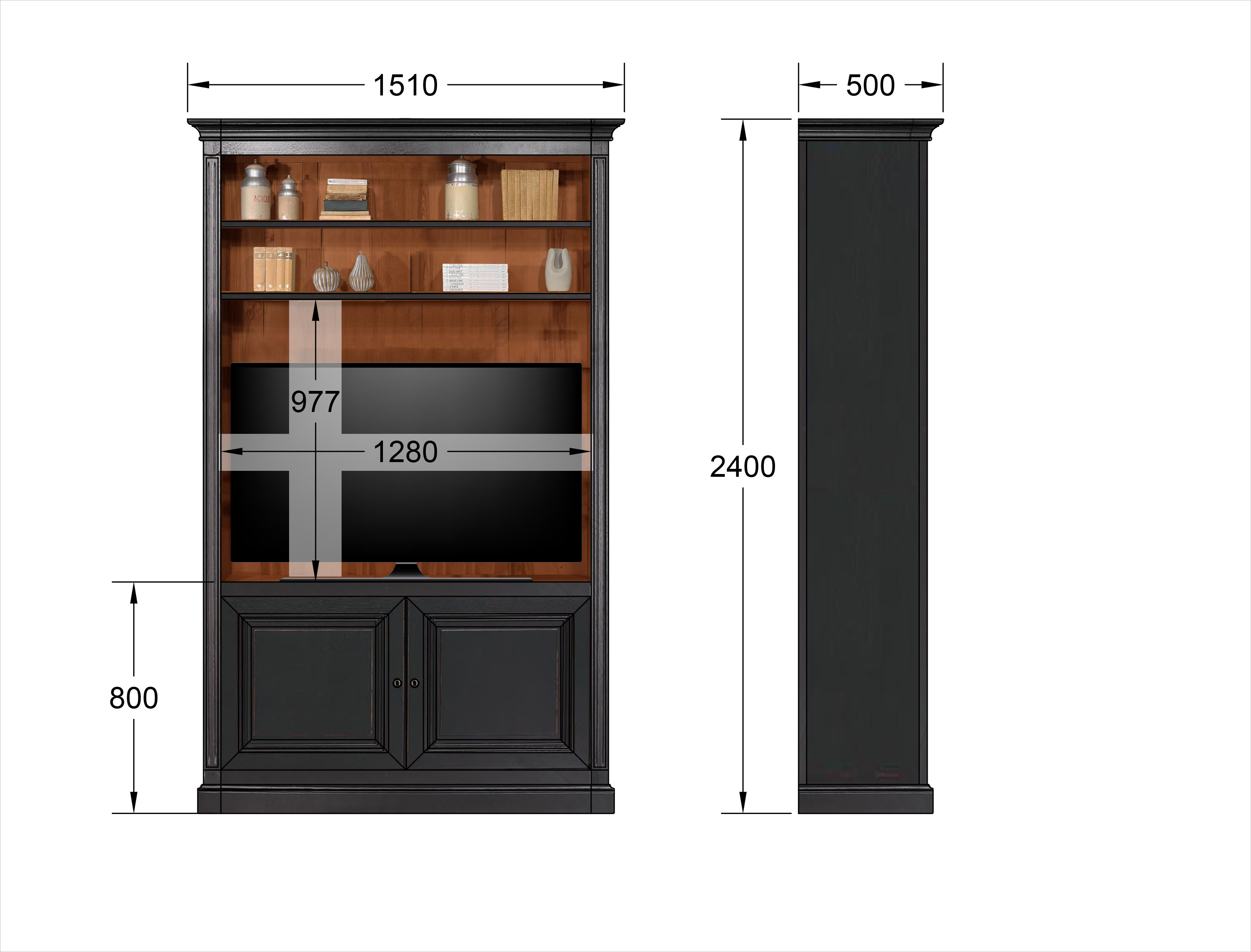 Bibliothèque réalisée en Chêne Massif de style Directoire. En bas, 2 portes avec à l'intérieur 1 étagère montée sur crémaillères en bois En haut, 1 module avec 5 étagères réglables sur crémaillères en bois sur toute la longueur, Les fonds et les étagères sont en Frêne Massif. Fabrication traditionnelle, Démontable Vis de rappel afin de faciliter le montage et le démontage. Sa finition est un chêne brossé noir patiné pour l'extérieur, chêne naturel pour l'intérieur.