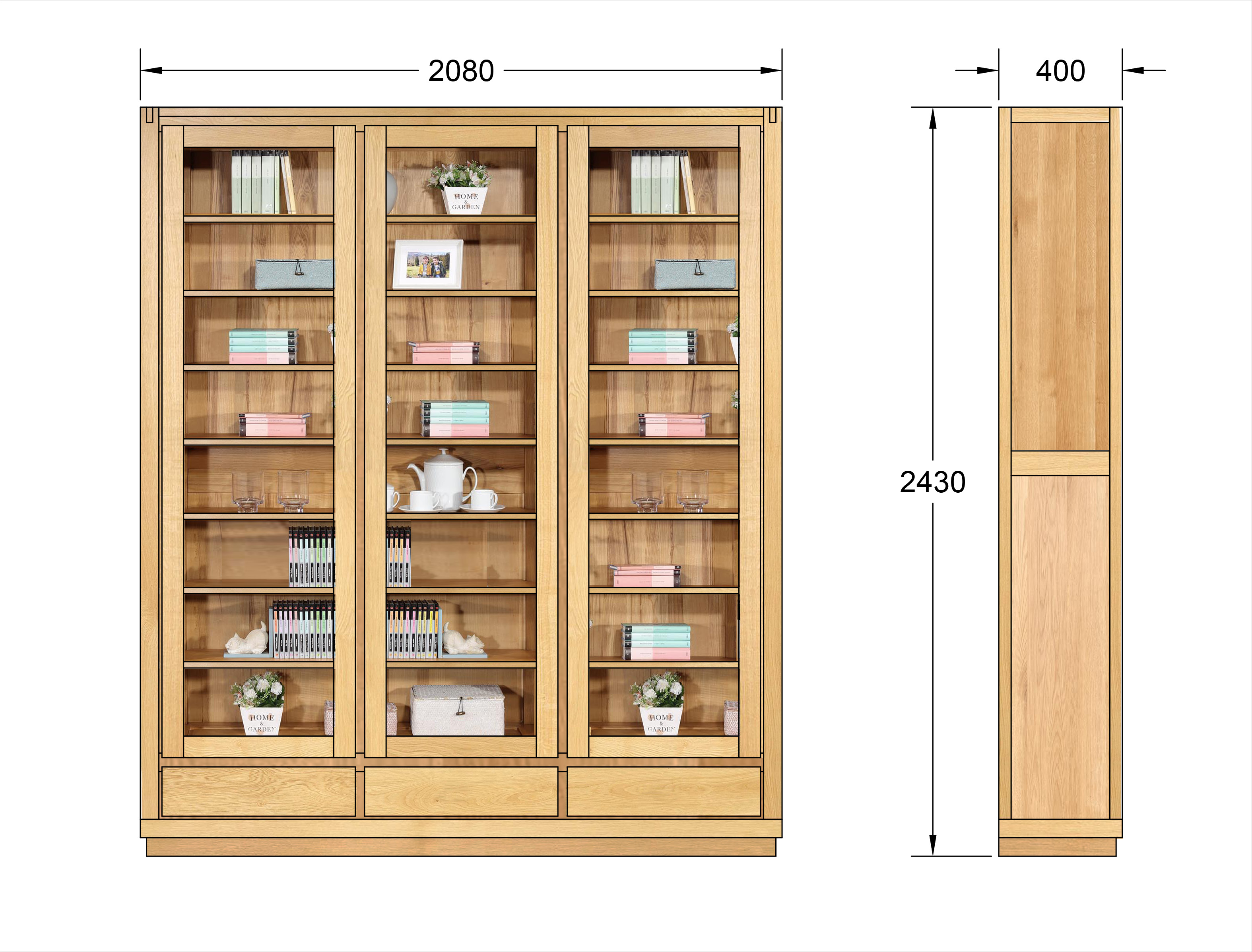 Bibliothèque 3 portes 3 tiroirs réalisée en Chêne LIGNE CONTEMPORAINE A l'intérieur se trouvent 7 étagères montées sur crémaillères en bois, dans chaque porte, 3 tiroirs montés sur glissières métalliques, La bibliothèque est démontable, Sa finition est un chêne naturel ou selon votre convenance, N'hésitez pas à demander nos échantillons de bois !